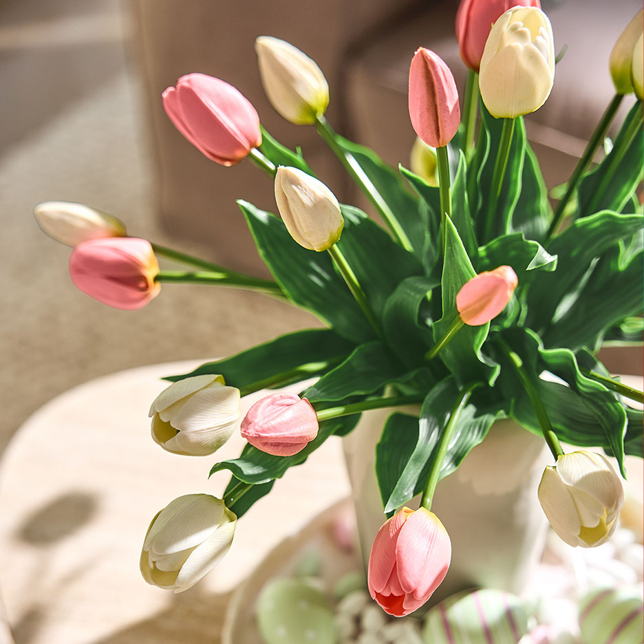 Easter table decorations: enjoy the feast with all your sensesWhether you're hosting a lavish Easter brunch or enjoying coffee and cake for two: Your Easter table practically sets itself. A fresh spring tablecloth transforms every table into the perfect centrepiece for the Easter feast. If you opt for naturalistic meadow flower motifs and trendy colours, the tablecloth will not only accompany you through the Easter holidays, but also through spring, summer and autumn. You don't need to go to the florist or your garden for this. A high-quality artificial tulip bouquet is almost indistinguishable from the original - and stays fresh forever. If you want to give the bouquet a personal touch and even more of an Easter feeling, mix the flowers with pussy willow twigs, for example, and decorate everything with Easter egg pendants. Decorating professionals rely on harmonious colours, but there are no limits to your imagination.extra tip: Keep the bouquet of tulips in a cool, dry and dark place until next spring. It is best to wrap the flower heads in tissue paper or cloth and place the bouquet individually in a box. The perfect Easter menu, of course! Discover classic and trendy dishes for your Easter brunch in the LIDL recipe world.