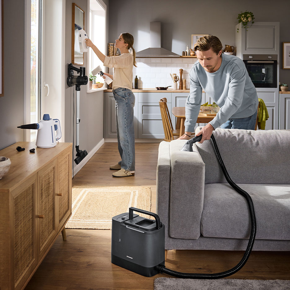 Cleaning sofas with a steam cleanerSteam cleaners are extra thorough. The steam, which is heated to around 150 degrees, reliably kills germs and dust mites - ideal for allergy sufferers. The steam penetrates deep into the upholstery and removes stubborn and ingrained dirt as well as unpleasant odours.use your steam cleaner with a suitable fabric cover. This distributes the steam, prevents scratches and traps dirt. After cleaning, you can put the cover in the washing machine Important: Before using the steam cleaner, always check whether your upholstered furniture is designed for it. Look at the care recommendation and do a test on a non-visible area. Otherwise fibres or the colour may come loose from the fabric.